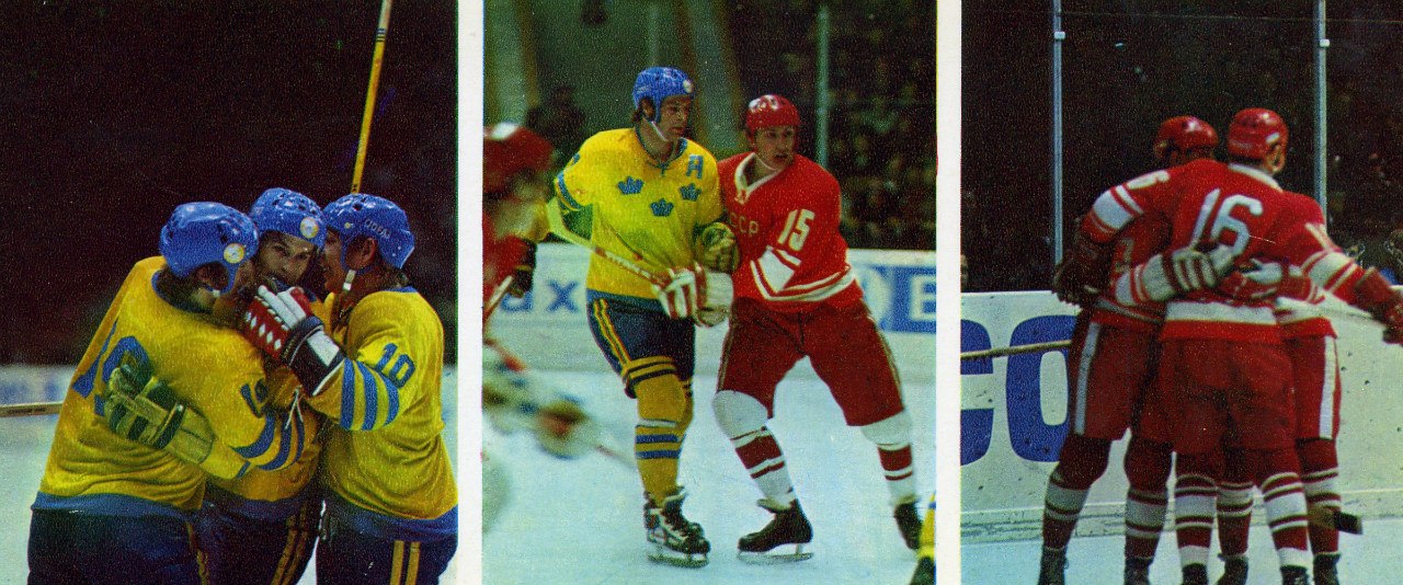 1 Opening of the World Cup (vertical) 2 Match of the USSR – Czechoslovakia 3 Match of the USSR – Sweden 4 Match of the USSR – Czechoslovakia 5 Team Sweden - silver medalist 6 Team Czechoslovakia - bronze medalist 7 USSR squad won all matches 8 Match of the USSR – Sweden 9 Match of the USSR – Sweden 10 World Champions (Yakushev / Tsygankov / Ragulin) 11 World Champions (Tretyak / Petrov) 12 Jiri Holecek - the best goalkeeper (vertical) 13 Valery Vasiljev - the best defender (vertical) 14 Boris Mikhailov - the best striker (vertical) 15 The last match of the championship 16 The winners of the World Cup and European hockey 17 The museum's displays of physical culture and sports