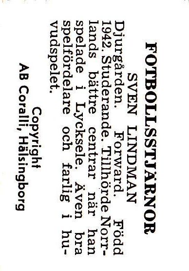 Örebro SK 7-1 Yngve Hindrikes 7-2 S-G Larsson 7-3 Lennart Kjellin 7-4 Ronnie Olsson 7-5 Anders Edh 7-6 Tommy Jepsson 7-7 Göran Kummelstedt 7-8 Thomas Nordahl 7-9 Kenneth Karlsson 7-10 Olle Gustavsson 7-11 Ove Holmqvist 7-12 Sören Andersson - Never Issued - IFK Göteborg 7-26 Karl-Henrik Larsson 7-27 ??? 7-28 Håkan Eklund 7-29 Reine Feldt 7-30 Jan Sjöström 7-31 Ralph Bergström 7-32 Gunro Lindberg 7-33 Lennart Wallin 7-34 Ingvar Svensson 7-35 Bengt "Fölet" Berndtsson 7-36 Bertil "Bebben" Johansson 7-37 Leif Claesson 7-38 Harry Svensson 7-39 Rolf Pettersson 7-40 ??? 7-41 ??? 7-42 ??? 7-43 Kjell-Åke Carlsson - Never Issued - Örgryte IS 7-51 Bert Wåhlin 7-52 Lennert Otterdahl 7-53 Sven Johansson 7-54 Sten Rinäs 7-55 Rolf Wetterlind 7-56 Bo Åkervall 7-57 Lars-Göran Johansson 7-58 Agne Simonsson 7-59 Rune Börjesson 7-60 Claes-Olof Arvidsson 7-61 Lars Gunnskog 7-62 Lars Bäck 7-63 Wilgot Schwartz 7-64 Rolf Hansson - Never Issued - Elfsborg 7-79 Bo Falk Same number! 7-79 Roger Karlsson Same number! 7-80 Hans Höglund 7-81 Leif Ohlsson 7-82 Sven Andersson 7-83 Wigarth Bartholdsson 7-84 Lars Heineman 7-85 John Hedin 7-86 Ove Westerberg 7-87 Jan-Olof Modig 7-88 Hans Gustafsson - Never Issued - IFK Holmsund 7-101 Arne Rehnberg 7-102 Kenneth Sjöblom 7-103 Sven Axel Lindström 7-104 Ola Nygren 7-105 Sören Hedman 7-106 Ronnie Bäckman 7-107 Åke Karlsson 7-108 Morgan Målberg 7-109 Gösta Nordahl 7-110 Perry Fredriksson 7-111 Ingvar Dellbring 7-113 Lennart "Hacke" Bäckström 7-114 Kent Nygren 7-115 Kjell Arctaedius 7-116 Pekka Utriainen - Never Issued - GAIS 7-126 Eddy Magnusson 7-127 Lars Ove Haraldsson 7-129 Sten Wessberg 7-130 Hasse Samuelsson 7-131 Leif Wendt 7-132 Bengt Johansson 7-133 Leif Andersson 7-134 Kent Grek 7-135 Yngve Samuelsson 7-136 Sune Persson 7-137 ??? 7-138 Christer Heideberg 7-139 Jan Olsson 7-140 Kent Olsson 7-141 Benny Apell - Never Issued - IFK Norrköping 7-151 Ulf Hultberg 7-152 Roland Pressfeldt 7-153 Bo La Fleur 7-154 Bill Björklund 7-155 Örjan Martinsson 7-156 Björn Nordqvist 7-157 Christer Hult 7-158 Ulf Jansson 7-159 Jan Olsson 7-160 Bo Nilsson 7-161 Per-Inge Jansson 7-162 Christer Sjölund 7-163 Bengt Lindström 7-164 Lars Berglund - Never Issued - Hammarby 7-176 Gösta "Gadden" Nielsen 7-177 Ronny Hellström 7-178 Håkan Magnusson 7-179 Björn Carlsvärd 7-180 Jan Holmberg 7-181 Christer Axelsson 7-182 Lars-Åke Fjällby 7-183 Lars Hellberg 7-184 Per Eriksson 7-185 Sune Fagerström 7-186 Inge Persson 7-187 Tom Turesson 7-188 Lars-Erik Karlsson 7-189 Kent Olsson - Never Issued - Djurgårdens IF 7-201 Rolf Fransson 7-202 Dan Bizokopil 7-203 Stenerik Jörnlind 7-204 Mats Karlsson 7-205 Willy Gummesson 7-206 Conny Granqvist 7-207 Sven Lindman 7-208 Stig Åkerström 7-209 Per-Arne Johansson 7-210 Peder Persson 7-211 Claes Cronqvist 7-212 Inge Karlsson 7-213 Olle Hellström 7-214 Björn Jonsson 7-215 Kay Wieståhl 7-216 Lars-Olof Sandberg 7-217 Sture Wahlsten 7-218 Jan-Erik Sjöberg 7-219 Ronnie Pettersson 7-220 Roland Magnusson - Never Issued - Hälsingborgs IF 7-226 Lars Ove Nilsson 7-227 Matts Johansson 7-228 Bo Johansson 7-229 Inge Danielsson 7-230 Rolf Marinus 7-231 Arne Friberg 7-232 Lars Andersson 7-233 Hans Selander 7-234 Ingemar Nilsson 7-235 Nils-Erik Persson 7-236 Sune Jönsson - Never Issued - AIK 7-251 Roland Grip 7-252 Tord Grip 7-253 Björn "Lill-Garvis" Carlsson 7-254 Tommy Stenborg 7-255 Lennart Söderberg 7-256 Roland "Rimbo" Lundblad 7-257 Lennart Backman 7-258 Björn Lundberg 7-259 Björn Eriksson 7-260 Olavus Olsson 7-261 Leif Hult 7-262 Curt Edenvik 7-263 Göran Åberg 7-264 Åke Olsson 7-265 Tommy Johansson 7-266 Owe Olsson 7-267 Gunnar Lund 7-268 Jim Nildén 7-269 Bo Holmberg - Never Issued - Malmö FF 7-276 Ingvar Svahn 7-277 Gert Arne Nilsson 7-278 Rolf Björklund 7-279 Jörgen Martinsson 7-280 Per-Olof Weinberg 7-281 Harry Jönsson 7-282 Dag Szepanski 7-283 Nils Hult 7-284 Jan Bengtsson 7-285 Björn Friberg 7-286 Krister Malmberg 7-287 Jörgen Ohlin 7-288 Staffan Tapper 7-289 Krister Kristensson