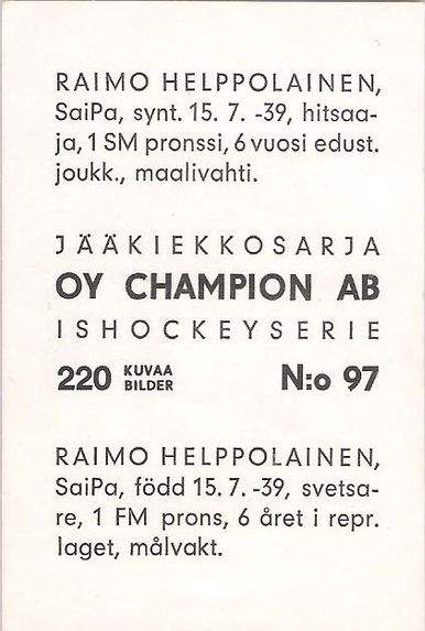 Rauman Lukko 1 Jukka Haapala 2 Simo Saimo 3 Hannu Törmä 4 Jukka Savunen 5 Tenho Lotila 6 Tapani Koskimäki 7 Matti Saurio 8 Risto Kaitala 9 Raimo Tiainen 10 Esa Isaksson 11 Pentti Rautalin 12 Helkko Stenvall 13 Teppo Rastio 14 Jorma Vehmanen Rosenlewin Urheilijat -38 15 Raimo Kilpiö 16 Veikko Ukkonen 17 Lauri Lehtonen 18 Heikki Veräväinen 19 Pentti Riitahaara 20 Pekka Kuusisto 21 Tapio Rautalammi 22 Raimo Tuli 23 Matti Päivinen 24 Matti Harju 25 Kari Sillanpää 26 Matti Keinonen 27 Pekka Lahti 28 Johannes Karttunen 29 Sakari Isomäki 30 Samu Leikko 31 Tapani Suominen Porin Karhut 32 Esa Vesslin 33 Pekka Jalava 34 Pertti Mäkelä 35 Juha Rantasila 36 Jukka Haanpää 37 Teuvo Helenius 38 Anto Virtanen 39 Kimmo Nokikuru 40 Jaakko Honkanen 41 Seppo Nyström 42 Tuomo Pirskainen 43 Matti Jansson 44 Alpo Suhonen 45 Matti Varpela 46 Kaj Matalamäki 47 Antti Heikkilä 48 Jaakko Jaskari 49 Jouko Ojansuu 50 Mikko Myllyniemi 51 Veli-Pekka Ketola 52 Matti Salmi Turun Toverit 53 Pentti Vihanto 54 Hannu Luojola 55 Seppo Parikka 56 Martti Salonen 57 Risto Forss 58 Hannu Niittoaho 59 Kari Johansson 60 Henry Leppä 61 Jarmo Rantanen 62 Kari Torkkel 63 Seppo Vikström 64 Veijo Saarinen 65 Pekka Lahtela 66 Risto Vainio 67 Reijo Paksal 68 Erkan Nasib 69 Matti Breilin 70 Voitto Soini 71 Urpo Ylönen Turun Palloseura 72 Rauno Heinonen 73 Heikki Heino 74 Lasse Kiili 75 Ilkka Mesikämmen 76 Timo Nummelin 77 Pertti Kuismanen 78 Juhani Wahlsten 79 Rauli Ottila 80 Pertti Karelius 81 Teuvo Andelmin 82 Kari Varjanen 83 Kalevi Leppänen 84 Juhani Iso-Eskeli 85 Hannu Koivunen Saimaan Pallo 86 Yrjö Hakala 87 Kari Ruontimo 88 Raimo Lohko 89 Markku Eiskonen 90 Hannu Lemander 91 Timo Väätämöinen 92 Pekka Moisio 93 Martti Mäkiä 94 Risto Heinvirta 95 Taisto Jahma 96 Veikko Mäkiä 97 Raimo Helppolainen 98 Lalli Partinen 99 Keijo Sinkkonen 100 Antti Ravi 101 Martti Sinkkonen 102 Heikki Juselius Lahden Reipas 103 Timo Rantala 104 Heikki Mikkola 105 Jaakko Siren 106 Matti Korhonen 107 Erkki Mononen 108 Pertti Valkonen 109 Ilpo Koskela 110 Bengt Wilenius 111 Hannu Lindberg 112 Kristen Bertell 113 Veikko Kuusisto 114 Tapio Majaniemi 115 Leo Vankka 116 Pentti Harju 117 Ari Myllymäki 118 Matti Koskinen 119 Pentti Andersson 120 Pertti Heikkinen 121 Pekka Peltoniemi 122 Jouko Järvinen 123 Matti Vartiainen Savonlinnan Pallokerho 124 Esko Reijonen 125 Erkki Räsänen 126 Timo Viskari 127 Raimo Turkulainen 128 Paavo Tirkkonen 129 Orvo Paatero 130 Juhani Leirivaara 131 Jyrki Turunen 132 Timo Tuomainen 133 Pentti Kärkkäinen 134 Jussi Piuhola 135 Pentti Pihlapuro 136 Pentti Pennanen 137 Esa Viskari 138 Timo Luostarinen 139 Seppo Iivonen 140 Risto Alho 141 Esko Kiuru 142 Jaakko Hovinheimo 143 Jaakko Koikkalainen 144 Juhani Södervik Tappara 145 Seppo Mäkinen 146 Teuvo Peltola 147 Antti Alenius 148 Kalevi Numminen 149 Esko Kaonpää 150 Lauri Salomaa 151 Risto Pirttiaho 152 Antti Leppänen 153 Kari Mäkinen 154 Jorma Oksala 155 Pekka Marjamäki 156 Jouni Seistamo 157 Pertti Ansakorpi 158 Erkki Jarkko 159 Juhani Peltola 160 Erkki Männikkö 161 Keijo Männistö 162 Matti Peltonen 163 Hannu Heikkonen 164 Pentti Hyytiäinen 165 Antti Virtanen Tampereen Kilpa-Veljet 166 Seppo Nurmi 167 Matti Reunamäki 168 Mikko Räikkönen 169 Esko Rantanen 170 Eero Holopainen 171 Juhani Ruohonen 172 Veikko Savolainen 173 Heikki Sivonen 174 Markku Pulli 175 Pekka Uitus 176 Heikki Keinonen 177 Jorma Saarikorpi 178 Rauno Lehtiö 179 Kalevi Toivonen 180 Jorma Vilen 181 Pentti Kuusinen 182 Olavi Haapalainen 183 Seppo Nikkilä 184 Jorma Suokko 185 Heino Pulli 186 Risto Lehtiö 187 Pekka Lehtolainen Ilves 188 Timo Hirsimäki 189 Kari Palo-Oja 190 Pekka Leimu 191 Ali Saadetin 192 Erkki Järvinen 193 Markku Hakanen 194 Jorma Kallio 195 Väinö Kolkka 196 Timo Saari 197 Jorma Peltonen 198 Pentti Pynnönen 199 Pentti Uotila 200 Timo Lahtinen 201 Juhani Lahtinen 202 Reijo Hakanen 203 Lasse Oksanen 204 Juhani Aromäki Hermes 205 Jukka Alkula 206 Pekka Olkkonen 207 Tapani Salo 208 Vesa Kartsalo 209 Antti Komsi 210 Asko Sallamaa 211 Juhani Tarkiainen 212 Antero Hakala 213 Ulf Slotte 214 Raimo Savolainen 215 Matias Savolainen 216 Risto Savolainen 217 Keijo Mäkinen 218 Tapio Mäkinen 219 Ossi Peltoniemi 220 Matti Välikangas