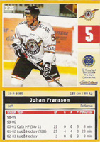 Brynäs 1 Joakim Lundström 2 Daniel Johansson 3 Tommy Sjödin 4 Adam Andersson 5 Veli-Pekka Laitinen 6 Jonas Soling 7 Simon Östlund 8 Roger Kyrö 9 Ove Molin 10 Björn Danielsson 11 Tommi Miettinen Djurgården 12 Joaquin Gage 13 Ronnie Pettersson 14 Niklas Kronwall 15 Björn Nord 16 Kristofer Ottosson 17 Daniel Rudslätt 18 Nichlas Falk 19 Mathias Tjärnqvist 20 Christian Eklund 21 Fredrik Lindquist 22 Mikael Johansson Frölunda 23 Fredrik Norrena 24 Kimmo Eronen 25 Ronnie Sundin 26 Erik Kakko 27 Mattias Luukkonen 28 Magnus Kahnberg 29 Jari Tolsa 30 Joel Lundqvist 31 Niklas Andersson 32 Peter Ström 33 Jens Karlsson Färjestad 34 Sinuhe Wallinheimo 35 Per Hållberg 36 Mats Trygg 37 Greger Artursson 38 Radek Hamr 39 Peter Nordström 40 Claes Eriksson 41 Pär Bäcker 42 Marcel Jenni 43 Peter Hammarström 44 Dieter Kalt HV71 45 Boo Ahl 46 Daniel Ljungqvist 47 Ola Thorwalls 48 Timmy Pettersson 49 Jouni Loponen 50 Jani Hassinen 51 Peter Ekelund 52 Kalle Sahlstedt 53 Pasi Määttänen 54 Mattias Remstam 55 Johan Davidsson Leksand 56 Jonas Elofsson 57 Christer Olsson 58 Lars Jonsson 59 Hans Lodin 60 Jens Nielsen 61 Niklas Eriksson 62 Mikael Pettersson 63 Tobias Holm 64 Niklas Persson 65 Göran Hermansson 66 Henrik Nordfeldt Linköping 67 Andreas Pihl 68 Jan Mertzig 69 Martin Knold 70 Andreas Holmqvist 71 Barry Richter 72 Johan Bülow 73 Fredrik Johansson 74 Tim Eriksson 75 Fredrik Emvall 76 Mikael Håkanson 77 Per Eklund Luleå 78 Gusten Törnqvist 79 Jonas Andersson-Junkka 80 Petter Nilsson 81 Pavel Skrbek 82 Johan Finnström 83 Stefan Nilsson 84 Kamil Brabenec 85 Thomas Berglund 86 Hans Huczkowski 87 Per Ledin Malmö 88 Andreas Hadelöv 89 Joakim Lundberg 90 David Petrasek 91 Petri Liimatainen 92 Peter Andersson 93 Frans Nielsen 94 Daniel Rydmark 95 Juha Riihijärvi 96 Jesper Mattsson 97 Toivo Suursoo 98 Mika Hannula MoDo 99 Juuso Riksman 100 Jan Öberg 101 Dusan Milo 102 Magnus Hedlund 103 Martin Wilde 104 Mika Lehtinen 105 Anders Söderberg 106 Tommy Pettersson 107 Peter Högardh 108 Peter Öberg 109 Joakim Lindström 110 Mattias Wennerberg Södertälje 111 Magnus Lindquist 112 Anders Back 113 Stefan Bemström 114 Peter Popovic 115 Peter Ahola 116 Robert Carlsson 117 Antti Törmänen 118 Gabriel Karlsson 119 Jörgen Bemström 120 Peter Larsson 121 Patrik Zetterberg Timrå 122 Kimmo Kapanen 123 David Halvardsson 124 Tommi Rajamäki 125 Kalle Koskinen 126 Pär Styf 127 Christian Söderström 128 Niklas Nordgren 129 Valeri Krykov 130 Per Hallin 131 Christian Sjögren 132 Markus Matthiasson Checklists 133 Brynäs IF 134 Djurgårdens IF 135 Frölunda Indians 136 Färjestads BK 137 HV71 138 Leksands IF 139 Linköpings HC 140 Luleå Hockey 141 MIF Redhawks 142 MoDo Hockey 143 Södertälje SK 144 Timrå IK Brynäs 145 Markus Korhonen 146 Mikko Kuparinen 147 Jesper Björck 148 Daniel Casselståhl 149 Henrik Malmström 150 Nicklas Danielsson 151 Jacob Johansson 152 Patrik Rönnqvist 153 Peter Nylander 154 Niklas Anger 155 Mikael Lind Djurgården 156 Björn Bjurling 157 Staffan Kronwall 158 Johnny Oduya 159 Mika Strömberg 160 Richard Lintner 161 Christopher Thörn 162 Jonathan Hedström 163 Tomas Kollar 164 Johannes Salmonsson 165 Fredrik Bremberg 166 Mikael Johansson 167 Marcus Kristoffersson 168 Stefan Pettersson 169 Kenneth Bergqvist Frölunda 170 Henrik Lundqvist 171 Jan-Axel Alavaara 172 Antti-Jussi Niemi 173 Oscar Ackeström 174 Alexander Steen 175 Loui Eriksson 176 Jonas Esbjörs 177 Jonas Johnson 178 Tomi Kallio Färjestad 179 Robin Jonsson 180 Jonas Frögren 181 Janne Grönvall 182 Hannes Hyvönen 183 Pelle Prestberg 184 Ulf Söderström 185 Mathias Johansson 186 Jörgen Jönsson 187 Fredrik Eriksson 188 Calle Steen HV71 189 Stefan Liv 190 Fredrik Olausson 191 Simon Skoog 192 Mika Niskanen 193 Johan Halvardsson 194 Stefan Hellkvist 195 Per-Åge Skröder 196 Martin Thörnberg 197 Anders Huusko 198 Björn Melin 199 Andreas Jämtin Leksand 200 Mike Bales 201 Johan Backlund 202 Richard Pavlikovsky 203 Tommy Westlund 204 Robert Nilsson 205 Johan Witehall 206 Christopher Lindholm 207 Joonas Jääskeläinen 208 Johan Rosén Linköping 209 Daniel Sperrle 210 Fredrik Norrena 211 Thomas Johansson 212 Peter Casparsson 213 Christoffer Norgren 214 Jyrki Välivaara 215 Johan Franzén 216 Mikko Peltola 217 Ragnar Karlsson 218 Pekka Tirkkonen 219 Mikael von der Geest 220 Andreas Sundin 221 Jussi Tarvainen 222 Johan Lindström Luleå 223 Daniel Henriksson 224 Jonas Johansson 225 Johan Fransson 226 Jan Sandström 227 Tuukka Mäntylä 228 Roger Åkerström 229 Jonas Rönnqvist 230 Linus Fagemo 231 Emil Lundberg 232 Jonas Nordquist 233 Jonas Hägerbäck 234 Magnus Nilsson 235 Johan Tellström 236 Pierre Berggren Malmö 237 Christopher Nihlstorp 238 Johan Björk 239 Magnus Österby 240 Johan Norgren 241 Jens Olsson 242 Jan Hammar 243 Marcus Magnertoft 244 Niklas Sundblad 245 Mikael Wahlberg 246 Kim Staal 247 Andreas Valdix MoDo 248 Kimmo Vesa 249 Jesper Damgaard 250 Martin Johansson 251 Lars Jansson 252 Magnus Wernblom 253 Fredrik Warg 254 Morten Green 255 Per Svartvadet 256 Magnus Gästrin Södertälje 257 Rolf Wanhainen 258 Johan Berggren 259 Bert Robertsson 260 Peter Messa 261 Jan Huokko 262 Joakim Eriksson 263 Urban Omark 264 Juha Lind 265 Bobbie Hagelin 266 Kristian Gahn Timrå 267 Mattias Öhrling 268 Jesper Jäger 269 Jan Nemecek 270 Sanny Lindström 271 Mats Hansson 272 Robert Carlsson 273 Yared Hagos 274 Lee Jinman 275 Fredrik Sundin 276 Toni Koivunen Checklists 277 Joakim Lundström 278 Björn Bjurling 279 Henrik Lundqvist 280 Sinuhe Wallinheimo 281 Boo Ahl 282 Johan Backlund 283 Fredrik Norrena 284 Gusten Törnquist 285 Andreas Hadelöv 286 Juuso Riksman 287 Rolf Wanhainen 288 Kimmo KapanenINSERTS Silver Parallell (1:4) Cards 1-144 SHL Rookies (1:8) 1 of 9 Adam Andersson Brynäs 2 of 9 Joakim Lundström Brynäs 3 of 9 Nicklas Eckerblom Djurgården 4 of 9 Alexander Steen Frölunda 5 of 9 Sebastian Meijer HV71 6 of 9 Robert Nilsson Leksand 7 of 9 Frans Nielsen Malmö 8 of 9 Tobias Enström MoDo 9 of 9