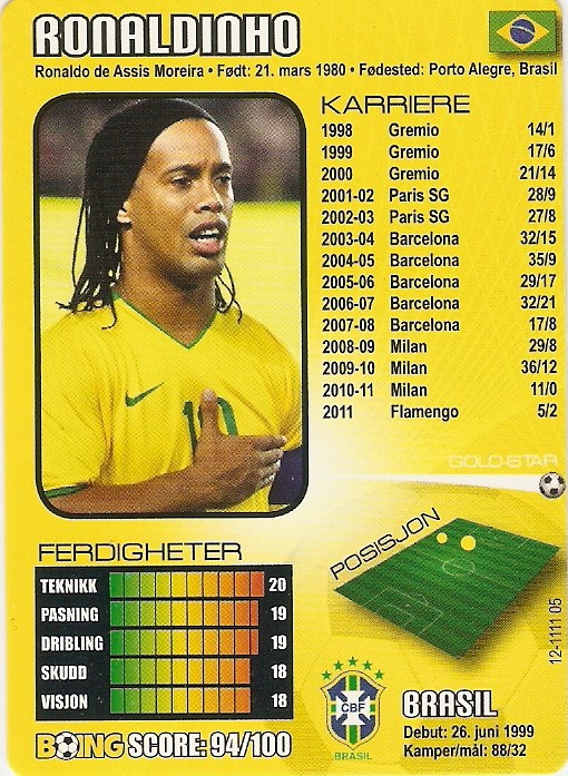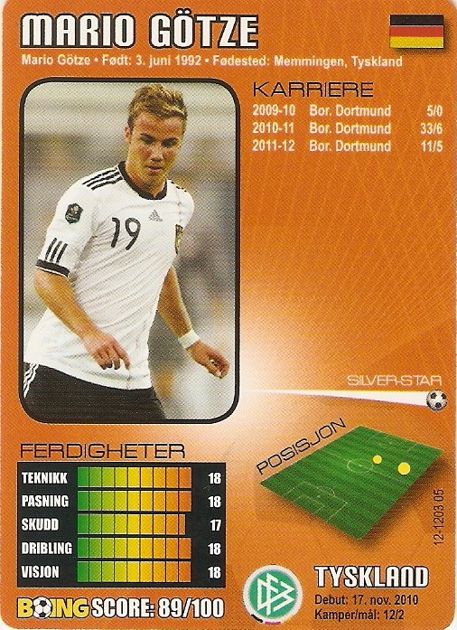 2011 April, unnumbered Mohammed Abdellaoue Hannover 96 & Norway Big-Star Joe Hart Manchester City & England Silver-Star Leonardo Bonucci Juventus & Italy Silver-Star David Villa Barcelona & Spain Gold-Star Dimitar Berbatov Manchester United & Bulgaria Gold-Star Robin van Persie Arsenal & Holland Gold-Star May, 12-1105 05 Lukasz Piszczek Borussia Dortmund & Poland Big-Star Moussa Sow Lille & Senegal Big-Star Glen Johnson Liverpool & England Silver-Star John Terry Chelsea & England Gold-Star Mesut Özil Real Madrid & Germany Gold-Star Samuel Eto'o Inter & Cameroon Gold-Star June, 12-1106 05 Diego Benaglio Wolfsburg & Switzerland Silver-Star Mathieu Flamini AC Milan & France Silver-Star Mounir El Hamdaoui Ajax & Morocco Silver-Star Ramires Santos Chelsea & Brazil Silver-Star Rafael van der Vaart Tottenham & Holland Gold-Star Sergio Aguero Atletico Madrid & Argentina Gold-Star July, 12-1107 05 Anthony Annan Schalke 04 & Ghana Silver-Star Asamoah Gyan Sunderland & Ghana Silver-Star Darren Bent Aston Villa & England Silver-Star Nicolas Burdisso AS Roma & Argentina Silver-Star Raul Meireles Liverpool & Portugal Silver-Star Andres Iniesta Barcelona & Spain Gold-Star Boing Superstars Checklist No 1 (1104-1107) Gold-Star August, 12-1108 05 Ruben Yttergċrd Jenssen Tromsö IL & Norway Big-Star Fernando Muslera Lazio & Uruguay Silver-Star Stefan Kiessling Bayer Leverkusen & Germany Silver-Star David Silva Manchester City & Spain Gold-Star Marcelo da Silva Real Madrid & Brazil Gold-Star Nemanja Vidic Manchester United & Serbia Gold-Star September, 12-1109 05 Rune Almenning Jarstein Viking FK & Norway Big-Star Andy Carroll Liverpool & England Silver-Star Christian Maggio Napoli & Italy Silver-Star Fredy Guarin Porto & Colombia Silver-Star Joel Matip Schalke 04 & Cameroon Silver-Star Mario Gomez Bayern München & Germany Silver-Star Paul Scharner West Bromwich & Austria Silver-Star Stephan Lichtsteiner Lazio & Switzerland Silver-Star Danielle de Rossi AS Roma & Italy Gold-Star Gerhard Pique Barcelona & Spain Gold-Star Iker Casillas Real Madrid & Spain Gold-Star Michael Essien Chelsea & Ghana Gold-Star October, 12-1110 05 Mikkel Diskerud Stabaek & USA Big-Star Giampaolo Pazzini Inter & Italy Silver-Star Rio Mavuba Lille & France Silver-Star Steven Pienaar Tottenham & South Africa Silver-Star Daniel Alves Barcelona & Brazil Gold-Star Wayne Rooney Manchester United & England Gold-Star Boing Superstars Checklist No 2 (1108-1110) Gold-Star November, 12-1111 05 Christian Grindheim FC Kĝbenhavn & Norway Silver-Star Darijo Srna Shakhtar Donetsk & Croatia Silver-Star Mamadou Sakho Paris Saint-Germain & France Silver-Star Zdravko Kuzmanovic Stuttgart & Serbia Silver-Star Gonzalo Higuain Real Madrid & Argentina Gold-Star Ronaldinho Flamengo & Brazil Gold-Star Zlatan Ibrahimovic AC Milan & Sweden Gold-Star December, 12-1112 05 Tarik Elyounoussi Fredrikstad & Norway Big-Star Aleksandar Kolarov Manchester City & Serbia Silver-Star Gabriel Agbonlahor Aston Villa & England Silver-Star Marko Marin Werder Bremen & Germany Silver-Star Matias Fernandez Sporting & Chile Silver-Star Michal Kadlec Bayer Leverkusen & Czech Republic Silver-Star Tom Högli Club Brugge & Norway Silver-Star Toni Kroos Bayern München & Germany Silver-Star Antonio Cassano AC Milan & Italy Gold-Star Fernando Torres Chelsea & Spain Gold-Star Gareth Bale Tottenham & Wales Gold-Star Luis Nani Manchester United & Portugal Gold-Star 2012 January, 12-1201 05 Erik Huseklepp Portsmouth & Norway Silver-Star Gervinho Arsenal & Ivory Coast Silver-Star Martin Harnik Stuttgart & Austria Silver-Star Edison Cavani Napoli & Uruguay Gold-Star Samir Nasri Manchester City & France Gold-Star Xavi Hernandez Barcelona & Spain Gold-Star Boing Superstars Checklist No 3 (1111-1201) Gold-Star February, 12-1202 05 Scott Brown Celtic & Scotland Silver-Star Sebastian Giovinco Parma & Italy Silver-Star Javier Hernandez Manchester United & Mexico Gold-Star Lionel Messi Barcelona & Argentina Gold-Star Manuel Neuer Bayern München & Germany Gold-Star Steven Gerrard Liverpool & England Gold-Star March, 12-1203 05 Axel Witsel Benfica & Belgium Silver-Star John Carew West Ham & Norway Silver-Star Jonas Goncalves Valencia & Brazil Silver-Star Mario Götze Borussia Dortmund & Germany Silver-Star Theo Walcott Arsenal & England Silver-Star Tim Krul Newcastle & Holland Silver-Star Alessandro Nesta AC Milan & Italy Gold-Star David Luiz Chelsea & Brazil Gold-Star Diego Forlan Inter & Uruguay Gold-Star Edin Dzeko Manchester City & Bosnia-Hercegovina Gold-Star Gianluigi Buffon Juventus & Italy Gold-Star Sergio Ramos Real Madrid & Spain Gold-Star April, 12-1204 05 Goliat Siklesaeter Sleivdal IL & Norway Big-Fiasco (cartoon) Daniel Agger Liverpool & Denmark Silver-Star John Arne Riise Fulham & Norway Silver-Star Klaas-Jan Huntelaar Schalke 04 & Holland Silver-Star Sebastian Larsson Sunderland & Sweden Silver-Star Karim Benzema Real Madrid & France Gold-Star Thiago Silva AC Milan & Brazil Gold-Star Boing Superstars Checklist No 4 (1202-1204) Gold-Star May, 12-1205 05 Robert Lewandowski Borussia Dortmund & Poland Silver-Star Yohan Cabaye Newcastle & France Silver-Star Cristiano Ronaldo Real Madrid & Portugal Gold-Star Frank Lampard Chelsea & England Gold-Star Guiseppe Rossi Villarreal & Italy Gold-Star Pepe Reina Liverpool & Spain Gold-Star June, 12-1206 05 Christian Eriksen Ajax & Denmark Silver-Star Jaroslav Plasil Bordeaux & Czech Republic Silver-Star Joao Moutinho Porto & Portugal Silver-Star Joris Mathijsen Malaga & Holland Silver-Star Mats Hummels Borussia Dortmund & Germany Silver-Star Olivier Giroud Montpellier & France Silver-Star Roman Shirokov Zenit St. Petersburg & Russia Silver-Star Andrea Pirlo Juventus & Italy Gold-Star Cesc Fabregas Barcelona & Spain Gold-Star Luka Modric Tottenham & Croatia Gold-Star Rio Ferdinand Manchester United & England Gold-Star Shay Given Aston Villa & Ireland Gold-Star July, 12-1207 05 Andre Schürrle Bayer Leverkusen & Germany Silver-Star Charlie Adam L