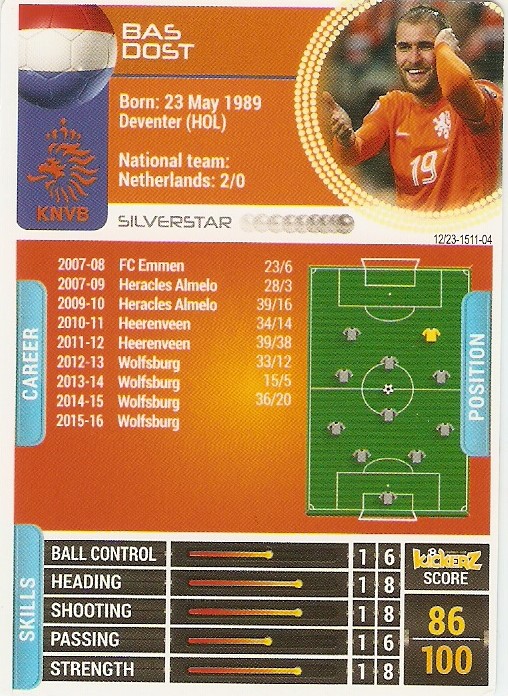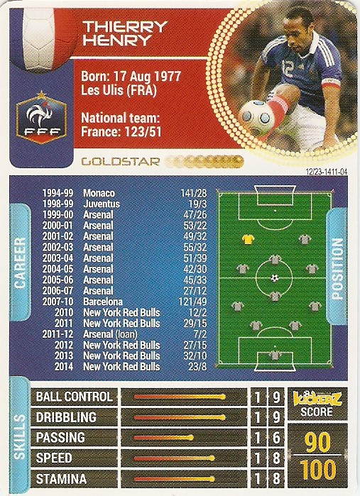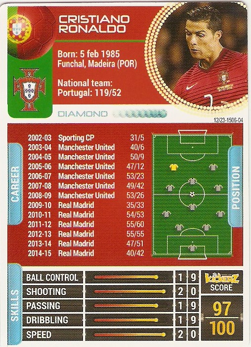 2014 August, 12/23-1408 04 Cristian Rodriguez Atletico Madrid & Uruguay Silver-Star Jaspar Cillessen Ajax & Holland Silver-Star Josh Kennedy Nagoya Grampus Eight & Australia Silver-Star Steven Defour FC Porto & Belgium Silver-Star Alberto Aquilani Fiorentina & Italy Gold-Star Cesar Azpilicueta Chelsea & Spain Gold-Star Keisuke Honda AC Milan & Japan Gold-Star Philipp Lahm Bayern München & Germany Gold-Star Raheem Sterling Liverpool & England Gold-Star Seamus Coleman Everton & Ireland Gold-Star Thiago Silva Paris Saint-Germain & Brazil Gold-Star Yaya Touré Manchester City & Ivory Coast Diamond September, 12/23-1409 04 Diego Benaglio Wolfsburg & Switzerland Silver-Star Eric Maxim Choupo-Moting Mainz 05 & Cameroon Silver-Star Heung-Min Son Bayer Leverkusen & South Korea Silver-Star Marco Parolo Parma & Italy Silver-Star Mats Möller-Daehli Cardiff & Norway Silver-Star Pierre Bengtsson FC København & Sweden Silver-Star Dries Martens Napoli & Belgium Gold-Star Joao Moutinho Monaco & Portugal Gold-Star Jordan Henderson Liverpool & England Gold-Star Per Mertesacker Arsenal & Germany Gold-Star Willian Chelsea & Brazil Gold-Star Gareth Bale Real Madrid & Wales Diamond October, 12/23-1410 04 Charles Aranguiz Internacional & Chile Silver-Star Diego Godin Atletico Madrid & Uruguay Silver-Star Fabian Schär FC Basel & Switzerland Silver-Star Leonardo Bonucci Juventus & Italy Silver-Star Nikica Jelavic Hull City & Croatia Silver-Star Ogenyi Onazi Lazio & Nigeria Silver-Star Ricky Alvarez Inter & Argentina Silver-Star Hugo Lloris Tottenham & France Gold-Star Karim Benzema Real Madrid & France Gold-Star Leighton Baines Everton & England Gold-Star Nigel De Jong AC Milan & Holland Gold-Star Thomas Müller Bayern München & Germany Gold-Star November, 12/23-1411 04 Costel Pantilimon Sunderland & Romania Silver-Star Enner Valencia West Ham & Ecuador Silver-Star Gökhan Inler Napoli & Switzerland Silver-Star Per Ciljan Skjelbred Herha Berlin & Norway Silver-Star Phil Jones Manchester United & England Silver-Star Bastian Schweinsteiger Bayern München & Germany Gold-Star Ivan Rakitic Barcelona & Croatia Gold-Star Jeremy Menez AC Milan & France Gold-Star Ramires Chelsea & Brazil Gold-Star Romelu Lukaku Everton & Belgium Gold-Star Thierry Henry New York Red Bulls & France Gold-Star Zlatan Ibrahimovic Paris Saint-Germain & Sweden Diamond December, 12/23-1412 04 Alberto Moreno Liverpool & Spain Silver-Star Bryan Ruiz Fulham & Costa Rica Silver-Star Markus Rosenberg Malmö FF & Sweden Silver-Star Nicklas Bendtner Wolfsburg & Denmark Silver-Star Rémy Cabella Newcastle & France Silver-Star Alexis Sanchez Arsenal & Chile Gold-Star Daley Blind Manchester United & Holland Gold-Star Joe Hart Manchester City & England Gold-Star Mario Gomez Fiorentina & Germany Gold-Star Paul Pogba Juventus & France Gold-Star Pierre-Emerick Aubameyang Borussia Dortmund & Gabon Gold-Star Diego Costa Chelsea & Spain Diamond 2015 January, 12/23-1501 04 Brede Hangeland Crystal Palace & Norway Silver-Star Darijo Srna Shakthar Donetsk & Croatia Silver-Star Erkan Zengin Eskisehirspor & Sweden Silver-Star Marcos Rojo Manchester United & Argentina Silver-Star Mathis Bolly Fortuna Düsseldorf & Ivory Coast Silver-Star Angel Di Maria Manchester United & Argentina Gold-Star Arturo Vidal Juventus & Chile Gold-Star Eden Hazard Chelsea & Belgium Gold-Star Mats Hummels Borussia Dortmund & Germany Gold-Star Sergio Ramos Real Madrid & Spain Gold-Star Steven Gerrard Liverpool & England Gold-Star Neymar Jr Barcelona & Brazil Diamond February, 12/23-1502 04 Adrian Ramos Borussia Dortmund & Colombia Silver-Star Emil Hallfredsson Verona & Iceland Silver-Star Giacomo Bonaventura AC Milan & Italy Silver-Star Karim Bellarabi Bayer Leverkusen & Germany Silver-Star Shinji Okazaki Mainz 05 & Japan Silver-Star Stéphane Mbia Sevilla & Cameroon Silver-Star Yacine Brahimi Porto & Algeria Silver-Star Giorgio Chiellini Juventus & Italy Gold-Star Jerome Boateng Bayern München & Germany Gold-Star Juan Mata Manchester United & Spain Gold-Star Keylor Navas Real Madrid & Costa Rica Gold-Star Vincent Kompany Manchester City & Belgium Gold-Star Wojiciech Szczesny Arsenal & Poland Gold-Star *** Possibly 1 card was incorrectly numbered and belongs to the March issue *** March, 12/23-1503 04 Adam Lallana Liverpool & England Silver-Star Gaël Clichy Manchester City & France Silver-Star Martin Ödegaard Strömgodset & Norway Silver-Star Mateo Kovacic Inter & Croatia Silver-Star Max Kruse Borussia Mönchengladbach & Germany Silver-Star Ola Toivonen Rennes & Sweden Silver-Star Semih Kaya Galatasaray & Turkey Silver-Star Christian Eriksen Tottenham & Denmark Gold-Star David De Gea Manchester United & Spain Gold-Star Toni Kroos Real Madrid & Germany Gold-Star Andres Iniesta Barcelona & Spain Diamond *** Probably 1 more card issued *** April, 12/23-1504 04 Julian Draxler Schalke 04 & Germany Silver-Star Lasse Schöne Ajax & Denmark Silver-Star Luiz Adriano Shakhtar Donetsk & Brazil Silver-Star Mattia De Sciglio AC Milan & Italy Silver-Star Nathaniel Clyne Southampton & England Silver-Star Phil Jagielka Everton & England Silver-Star David Silva Manchester City & Spain Gold-Star Isco Alarcon Real Madrid & Spain Gold-Star Jackson Martinez Porto & Colombia Gold-Star Jordi Alba Barcelona & Spain Gold-Star Nemanja Matic Chelsea & Serbia Gold-Star Samir Handanovic Inter & Slovenia Gold-Star May, 12/23-1505 04 Chris Smalling Manchester United & England Silver-Star Mikael Lustig Celtic & Sweden Silver-Star Ricardo Rodriguez Wolfsburg & Switzerland Silver-Star Roman Eremenko CSKA Moskva & Finland Silver-Star Rui Patricio Sporting & Portugal Silver-Star Tarik Elyounoussi Hoffenheim & Norway Silver-Star Aaron Ramsay Arsenal & Wales Gold-Star Claudio Marchisio Juventus & Italy Gold-Star Edison Cavani Paris Saint-Germain & Uruguay Gold-Star Medhi Benatia Bayern München & Morocco Gold-Star Tim Howard Everton & USA Gold-Star Lionel Messi Barcelona & Argentina Diamond June, 12/23-1506 04 Brown Ideye