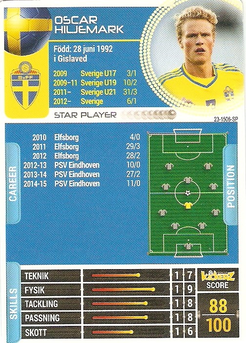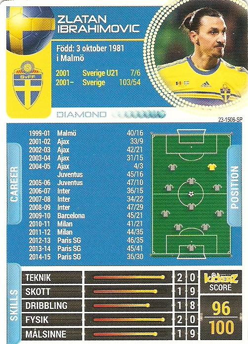 These cards were issued in Sweden only as a cooperation between Kickerz and SvFF (the Swedish Football Federation). The cards were given to particpating young boys and girls in the SvFF's football camps during the summer of 2015. Each pack contained 6 cards and a Zlatan card was in each pack, so that is the most common card of this set.