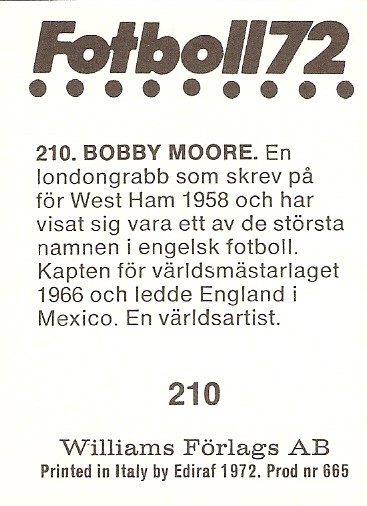 Sweden National Team 1 Ronnie Hellström 2 Christer Hult 3 Krister Kristensson 4 Björn Nordqvist 5 Roland Grip 6 Kurt Axelsson 7 Claes Cronqvist 8 Tommy Svensson 9 Bo Larsson 10 Jan Olsson 11 Sven Lindman 12 Thomas Nordahl 13 Ove Grahn 14 Ove Kindvall 15 Örjan Persson 16 Sten Pålsson 17 Roland Sandberg AIK 18 Ronny Gustafsson 19 Jörgen Bengtsson 20 Tommy Kastman 21 Börje Marcus 22 Olavus Olsson 23 Göran Åberg 24 Lars-Tony Hedström 25 Börje Leback 26 Jim Nildén 27 Rolf Zetterlund 28 Torbjörn Ek 29 Yngve Leback 30 Bo Sjögren 31 Dag Szepanski Djurgården 32 Björn Alkeby 33 Torgny Mattsson 34 Thommy Berggren 35 Inge Karlsson 36 Hans Nilsson 37 Jan-Erik Sjöberg 38 Conny Granqvist 39 Sven Lindman 40 Lars-Gunnar Rehnberg 41 Hans Jonsson 42 Kjell Nyberg 43 Kjell Samuelsson 44 Arne Skotte 45 Harry Svensson GAIS 46 Kjell Uppling 47 Erik De Broen 48 Nils Norrlander 49 Jan Olsson 50 Sune Persson 51 Yngve Samuelsson 52 Thomas Bloom 53 Roger Hansson 54 Conny Aldorsson 55 Eine Fredriksson 56 Hans Johansson 57 Eive Olofsson-Sandberg 58 Sten Pålsson 59 Kenneth Wessberg Halmstad 60 Tomas Ericsson 61 Lars Nordin 62 Lennart Alexandersson 63 Lars-Göran Carlsson 64 Jerker Jönsson 65 Kennet Larsson 66 Tommy Södergren 67 Ulf Alexandersson 68 Bengt-Göran Svensson 69 Gert Håkansson 70 Ingvar Andersson 71 Roland Fransson 72 Lars-Erik Larsson 73 John Lindau Hammarby 74 Ronnie Hellström 75 Björn Carlswärd 76 Peter Edlund 77 Björn Löf 78 Gunnar Qvarforth 79 Christer Ribohn 80 Mats Werner 81 Hans Cederfalk 82 Peter Claesson 83 Kenneth Olsson 84 Inge Persson 85 Lars-Ove Holmberg 86 Jan Sjöström 87 Tom Turesson Landskrona BoIS 88 Christer Olsson 89 Kenneth Dahlgren 90 Roger Karlsson 91 Dan Mårtensson 92 Jerry Rosengren 93 Gert-Inge Svensson 94 Kenneth Berg 95 Claes Cronqvist 96 Lars-Ove Nilsson 97 Tommy Gustafsson 98 Sonny Johansson 99 Krister Lindgren 100 Torbjörn Lindström 101 Jörn Petersson Arsenal 102 Frank McLintock 103 Bob Wilson 104 Bob McNab 105 Peter Storey 106 Charlie George 107 Ray Kennedy 108 John Radford 109 Alan Ball Chelsea 110 Ron Harris 111 Peter Bonetti 112 John Hollins 113 Peter Osgood 114 David Webb 115 Charlie Cooke 116 Ian Hutchinson 117 Alan Hudson Coventry 118 Bill Glazier 119 Willie Carr Crystel Palace 120 John Jackson 121 Bobby Tambling Everton 122 Brian Labone 123 Colin Harvey Derby 124 Colin Boulton 125 Colin Todd 126 Roy McFarland 127 Terry Hennesy 128 Kevin Hector 129 Alan Hinton 130 John O'Hare 131 Archie Gemmill Leeds 132 Gary Sprake 133 Terry Cooper 134 Billy Bremner 135 Jackie Charlton 136 Allan Clarke 137 Eddie Gray 138 Mick Jones 139 Peter Lorimer Liverpool 140 Ray Clemence 141 Tommy Smith 142 Emelyn Hughes 143 Alec Lindsay 144 John Toshack 145 Alun Evans 146 Steve Heighway 147 Peter Thompson Huddersfield 148 Dennis Clarke 149 Jimmy Nicholson Ipswich 150 Colin Viljoen 151 Frank Clarke Leicester 152 Peter Shilton 153 Alan Birchenall Dream Team of all times 154 Gordon Banks, England 155 Djalma Santos, Brazil 156 Franz Beckenbauer, West Germany 157 Bobby Moore, England 158 Nilton Santos, Brazil 159 Josef Boszik, Hungary 160 Bobby Charlton, England 161 Garrincha, Brazil 162 Pelé, Brazil 163 Alfredo di Stefano, Spain 164 Fransisco Gento, Spain Manchester C 165 Joe Corrigan 166 Tony Book 167 Tommy Booth 168 Mike Doyle 169 Colin Bell 170 Alan Oakes 171 Mike Summerbee 172 Francis Lee Manchester U 173 Alex Stepney 174 Tony Dunne 175 Bobby Charlton 176 Denis Law 177 George Best 178 Willie Morgan 179 Brian Kidd 180 Alan Gowling Newcastle 181 Bob Moncur 182 Wyn Davis Nottingham 183 Peter Cormack 184 Ian Moore Sheffield U 185 Trevor Hockey 186 Alan Woodward Stoke 187 Gordon Banks 188 John Marsh 189 Mike Bernard 190 Terry Conroy 191 Peter Dobing 192 John Ritchie 193 Jimmy Greenhoff 194 John Mahoney Southampton 195 Ron Davies 196 Mike Channon West Bromwich 197 Jeff Astle 198 Asa Hartford Wolverhampton 199 Derek Dougan 200 Hugh Curran Tottenham 201 Pat Jennings 202 Alan Mullery 203 Mike England 204 Steve Perryman 205 Martin Peters 206 Alan Gilzean 207 Martin Chivers 208 Ralph Coates West Ham 209 Bobby Ferguson 210 Bobby Moore 211 Tommy Taylor 212 Trevor Booking 213 Geoff Hurst 214 Bryan Robson 215 Jimmy Greaves 216 Clyde Best Malmö FF 217 Freddie Forsland 218 Nils Hult 219 Roland Andersson 220 Christer Jacobsson 221 Krister Kristensson 222 Staffan Tapper 223 Roy Andersson 224 Curt Olsberg 225 Roland Rasmusson 226 Conny Andersson 227 Tommy Andersson 228 Harry Jönsson 229 Bo Larsson 230 Christer Malmberg IFK Norrköping 231 Bengt Lindström 232 Christer Hult 233 Hans Larsson 234 Björn Nordqvist 235 Roland Pressfeldt 236 Per-Olof Eek 237 Gert Hellberg 238 Ove Karlsson 239 Ulf Hultberg 240 Ulf Jansson 241 Ove Kindvall 242 Bo Martinsson 243 Olle Nordin 244 Benny Wendt Åtvidaberg 245 Ulf Blomberg 246 Sten-Åke Andersson 247 Conny Gustafsson 248 Kent Karlsson 249 Jan Olsson 250 Lars-Göran Andersson 251 Bo Augustsson 252 Jörgen Augustsson 253 Benno Magnusson 254 Conny Torstensson 255 Ralf Edström 256 Lars Lundahl 257 Roland Sandberg 258 Veine Wallinder Örebro 259 Sven-Gunnar Larsson 260 Tomas Carlberg 261 Per-Anders Jonsson 262 Jan Linde 263 Ola Ljungberg 264 Arne Olsson 265 Jan-Olof Wallgren 266 Sven Andersson 267 Thomas Nordahl 268 Torbjörn Svensson 269 Bo Wilhelmsson 270 Tore Lennartsson 271 Jan Mossberg 272 Thomas Törnqvist Örgryte 273 Kenneth Forsberg 274 Yngve Källqvist 275 Peder Amberntsson 276 Krister Gustavsson 277 Berry Larsson 278 Bo Mattsson 279 Stefan Allbäck 280 Lars-Göran Johansson 281 Bo-Göran Börjesson 282 Peter Dahlqvist 283 Lennart Johansson 284 Lennart Johnsson 285 Lennart Ottordahl 286 Örjan Persson Öster 287 Göran Hagberg 288 Björn Andersson 289 Jan-Ivar Bergqvist 290 Per-Olof Bild 291 Karl-Axel Blomqvist 292 Mats Nordenberg 293 Leif Fransson 294 Anders Linderoth 295 Harry Bild 296 Björn Gustafsson 297 Hans Hansson 298 Tord Ljunggren 299 Jan Mattsson 300 Karl-Erik Stridh Team Logos The logo stickers were unnumbered and there were two 